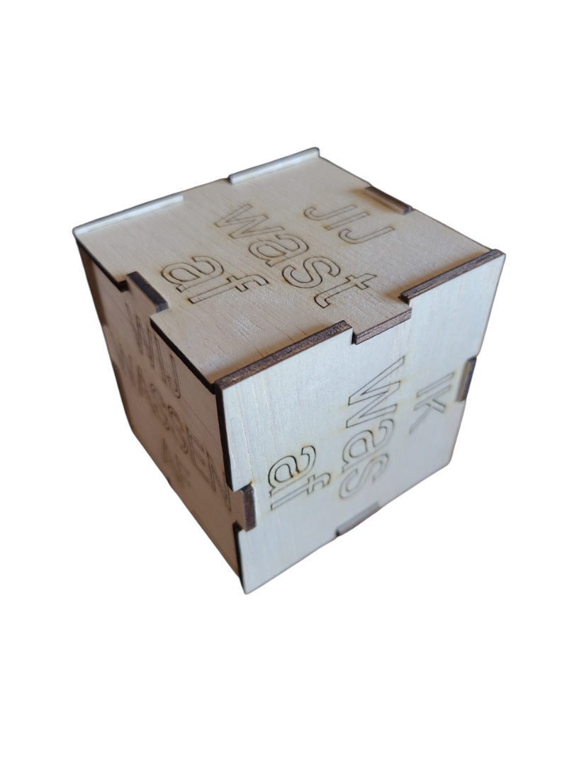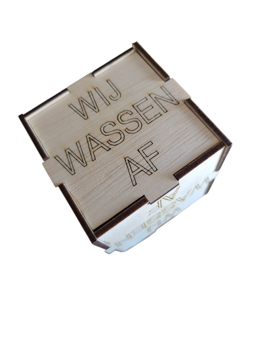 Houten dobbelsteen met de tekst ik was af, jij wast af, wij wassen af, 8x8cm, timmerplaat, 3mm