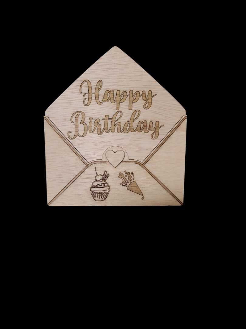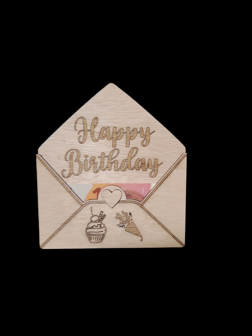 Houten envelop gemaakt van timmerplaat, met de tekst happy birthday, voor geld in te doen, geld niet inbegrepen,16x17,5cm, naturel.