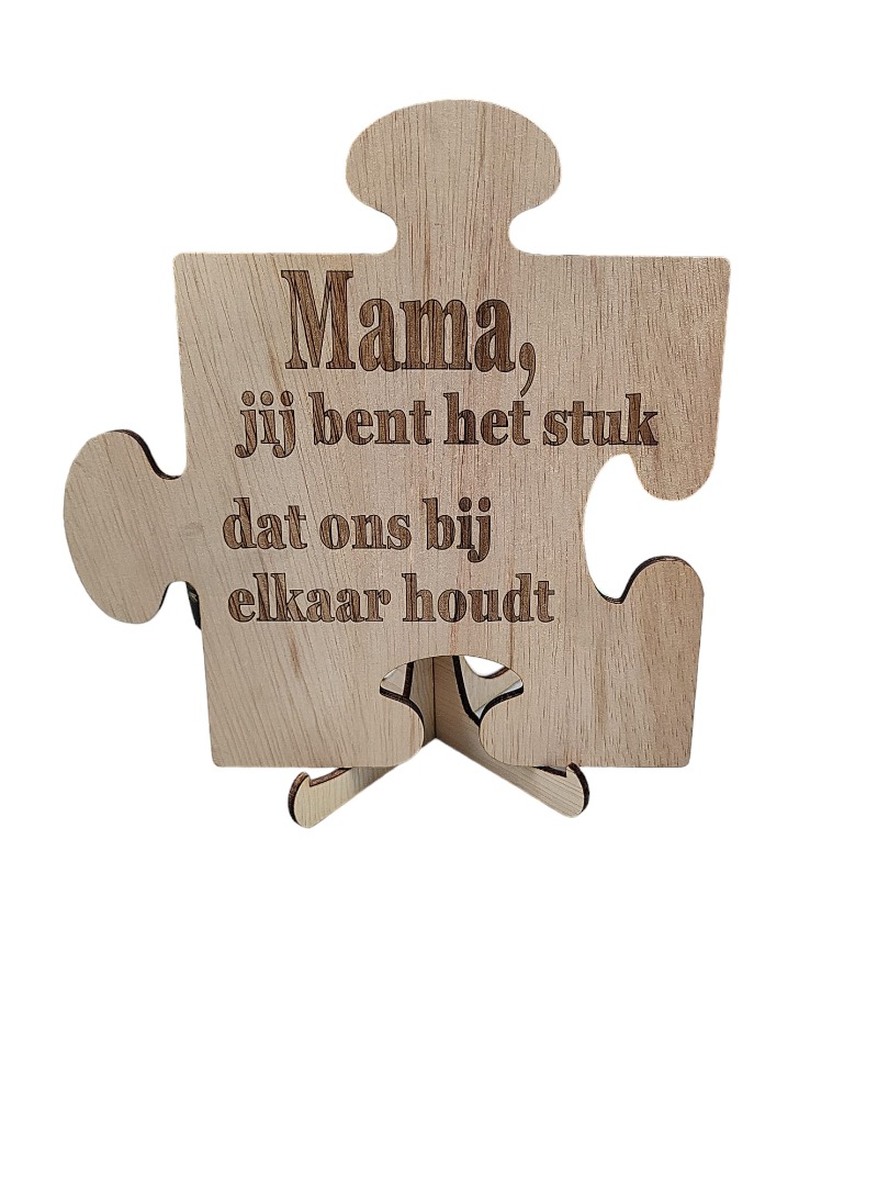 Houten tekstbordje in de vorm van een puzzel met de tekst mama, jij bent het stuk dat ons bij elkaar houdt in gegrafeerd, 18x18cm, timmerplaat, naturel, inclusief voetensteuntje.