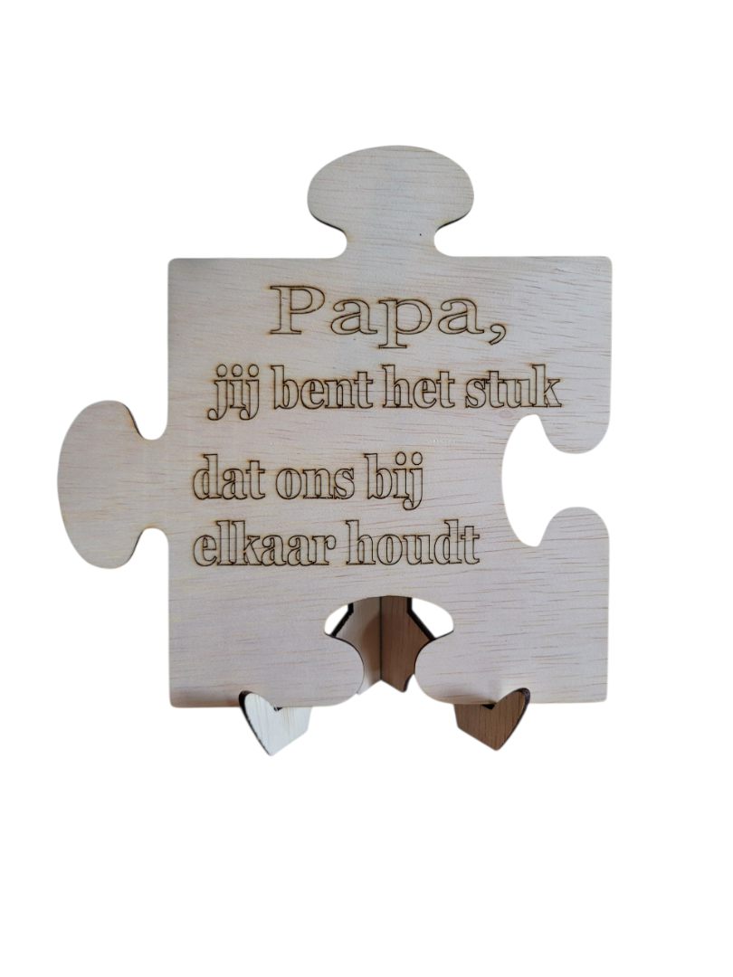 Houten tekstbordje in de vorm van een puzzel met de tekst mama, jij bent het stuk dat ons bij elkaar houdt in gegrafeerd, 13x13cm, timmerplaat, naturel, inclusief voetensteuntje, merkloos