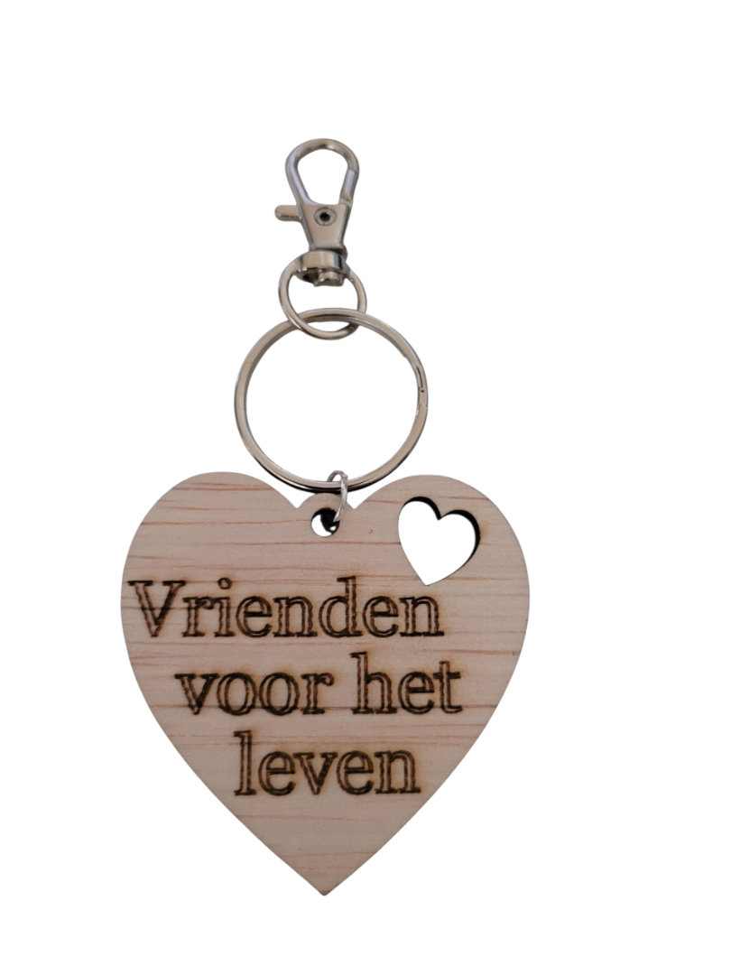 Houten sleutelhanger gemaakt van multiplex timmerplaat met de tekst vrienden voor het leven erin gegrafeerd, verkrijgbaar in de kleur naturel. Inclusief verzendkosten.