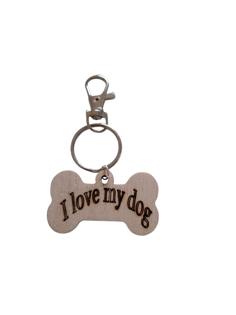 Houten sleutelhanger gemaakt van multiplex timmerplaat met de tekst I love my dog erin gegrafeerd, verkrijgbaar in de kleur naturel. Inclusief verzendkosten.