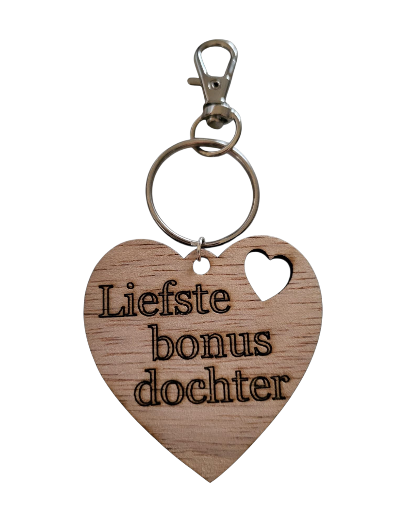Houten sleutelhanger gemaakt van multiplex timmerplaat met de tekst liefste bonusdochter erin gegrafeerd, verkrijgbaar in de kleur naturel. Inclusief verzendkosten.