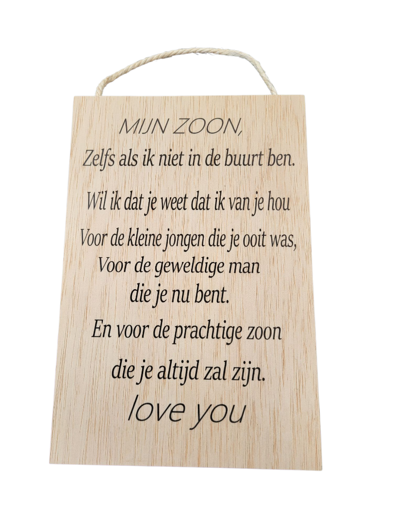 Houten laser tekstbord inclusief touw, gemaakt van vurenhout multiplex met de tekst mijn zoon (zelfs). Voor binnen en buiren gebruik, zijn behandeld. Merkloos