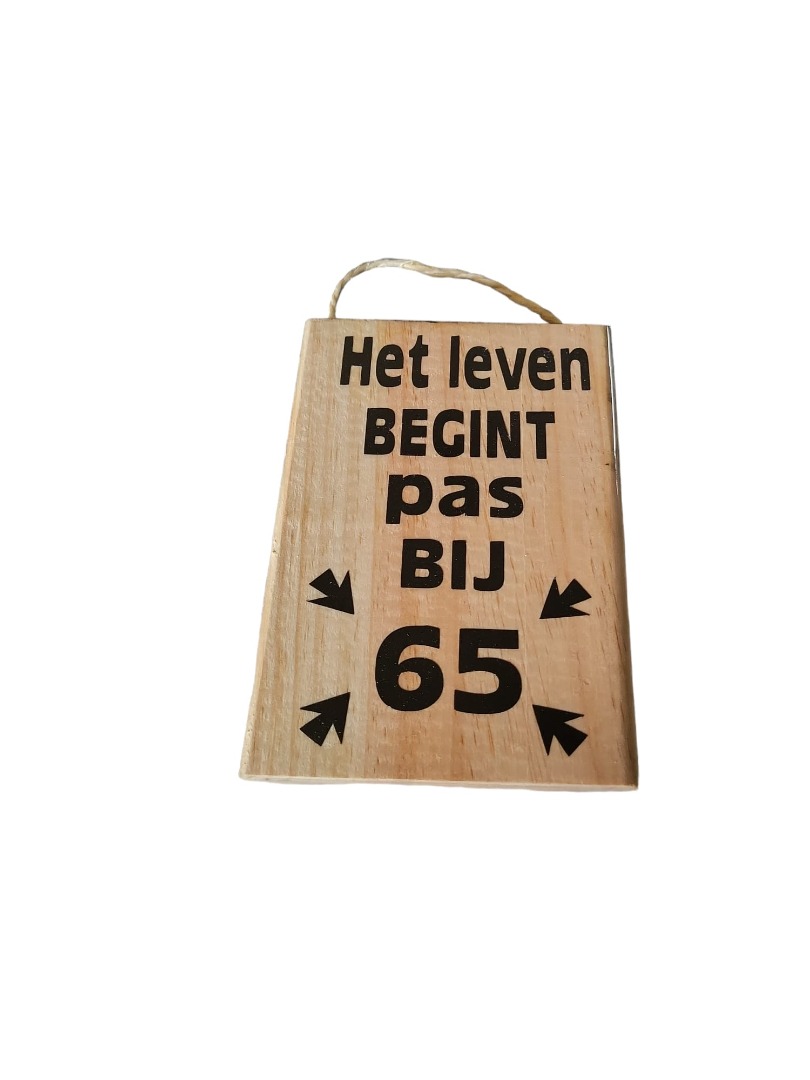 Kleine houten tekstbord gemaakt van timmerhout, 3mm, met de letters en cijfers gemaakt van vinyl stickers, met de tekst het leven begint bij 65, afmetingen 15x10cm, verkrijgbaar in de kleur naturel