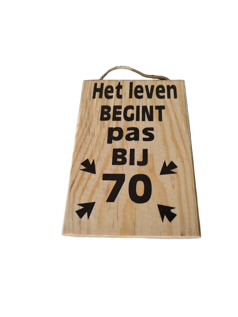 Kleine houten tekstbord gemaakt van timmerhout, 3mm, met de letters en cijfers gemaakt van vinyl stickers, met de tekst het leven begint bij 70, afmetingen 15x10cm, verkrijgbaar in de kleur naturel