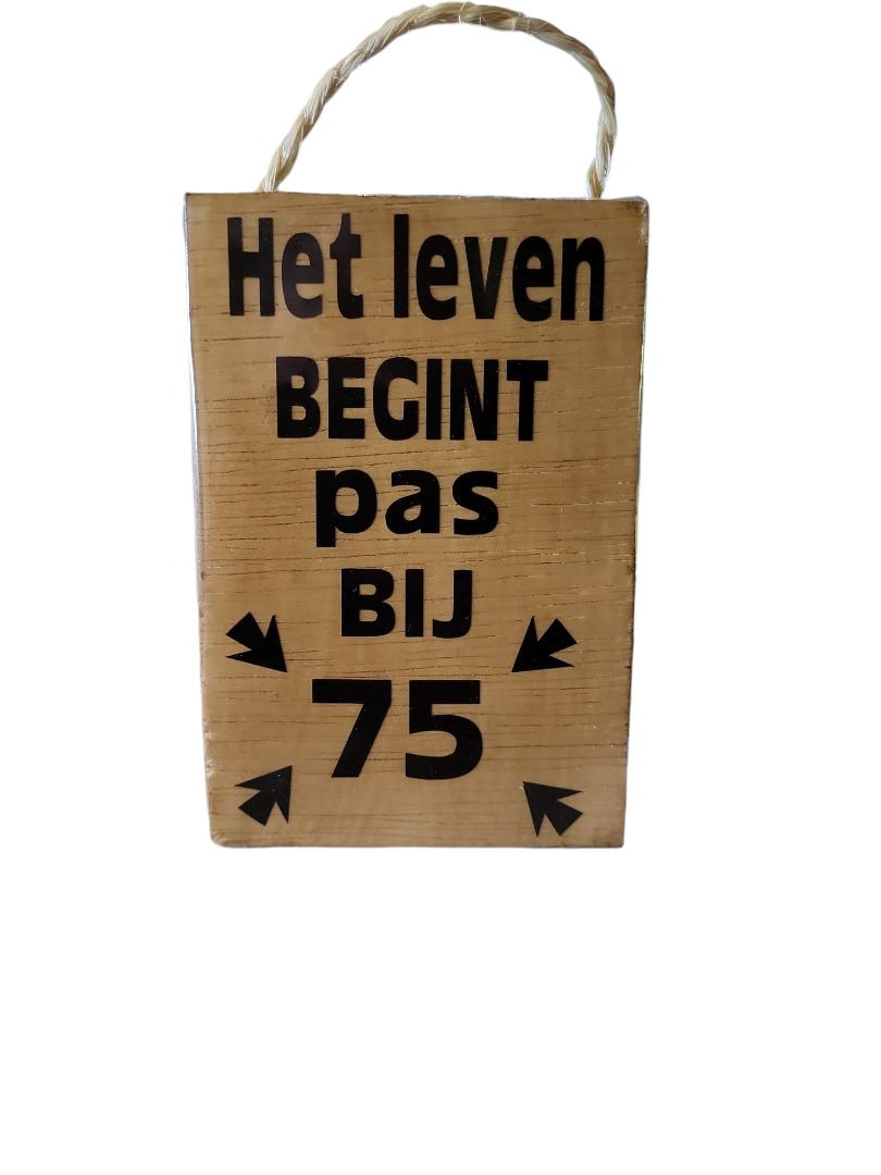 Kleine houten tekstbord gemaakt van timmerhout, 3mm, met de letters en cijfers gemaakt van vinyl stickers, met de tekst het leven begint bij 75, afmetingen 15x10cm, verkrijgbaar in de kleur naturel