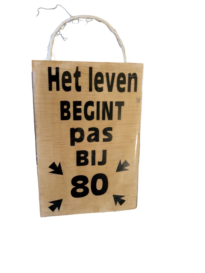 Kleine houten tekstbord gemaakt van timmerhout, 3mm, met de letters en cijfers gemaakt van vinyl stickers, met de tekst het leven begint bij 80, afmetingen 15x10cm, verkrijgbaar in de kleur naturel