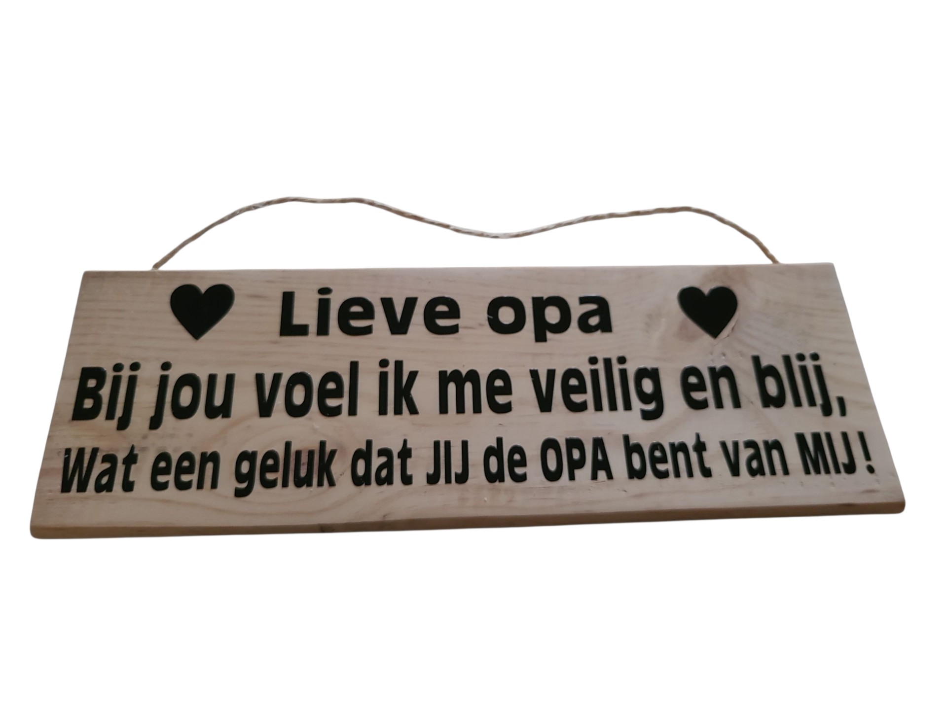 Houten tekstbord naturel met zwarte letters van plotter vinyl inclusief touw, met de tekst lieve opa, gemaakt van timmerplaat. 30x10cm. Voor binnen en buiten, zijn behandeld.