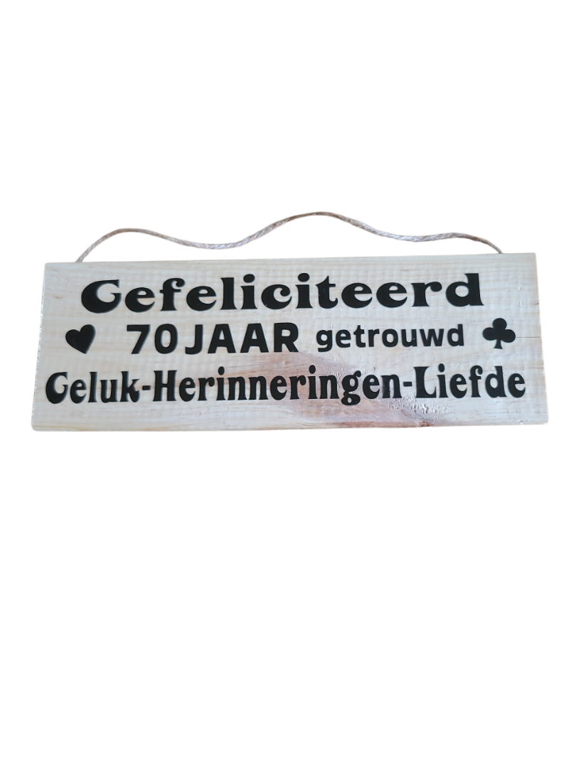 Houten tekstbord naturel met zwarte letters van plotter vinyl inclusief touw, met de tekst 70 jaar getrouwd, gemaakt van timmerplaat. 30x10cm. Voor binnen en buiten, zijn behandeld.