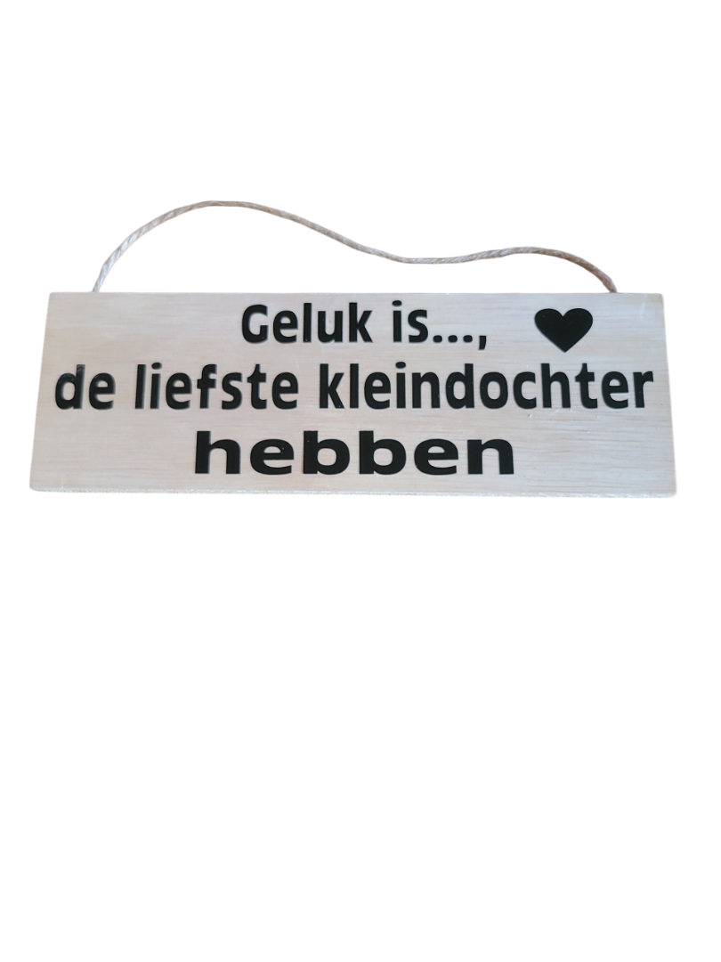 Houten tekstbord naturel met zwarte letters van plotter vinyl inclusief touw, met de tekst liefste kleindochter, gemaakt van timmerplaat. 30x10cm. Voor binnen en buiten, zijn behandeld.