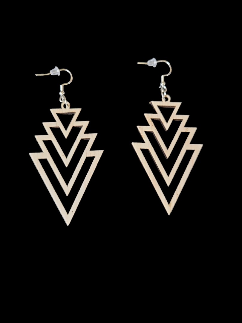 Houten lange oorbellen, genaamd lelie, gemaakt van timmerplaat 3 mm, afmeting 6 x 4 cm inclusief haakjes en dopje voor niet te verliezen. Inclusief verzendkosten.