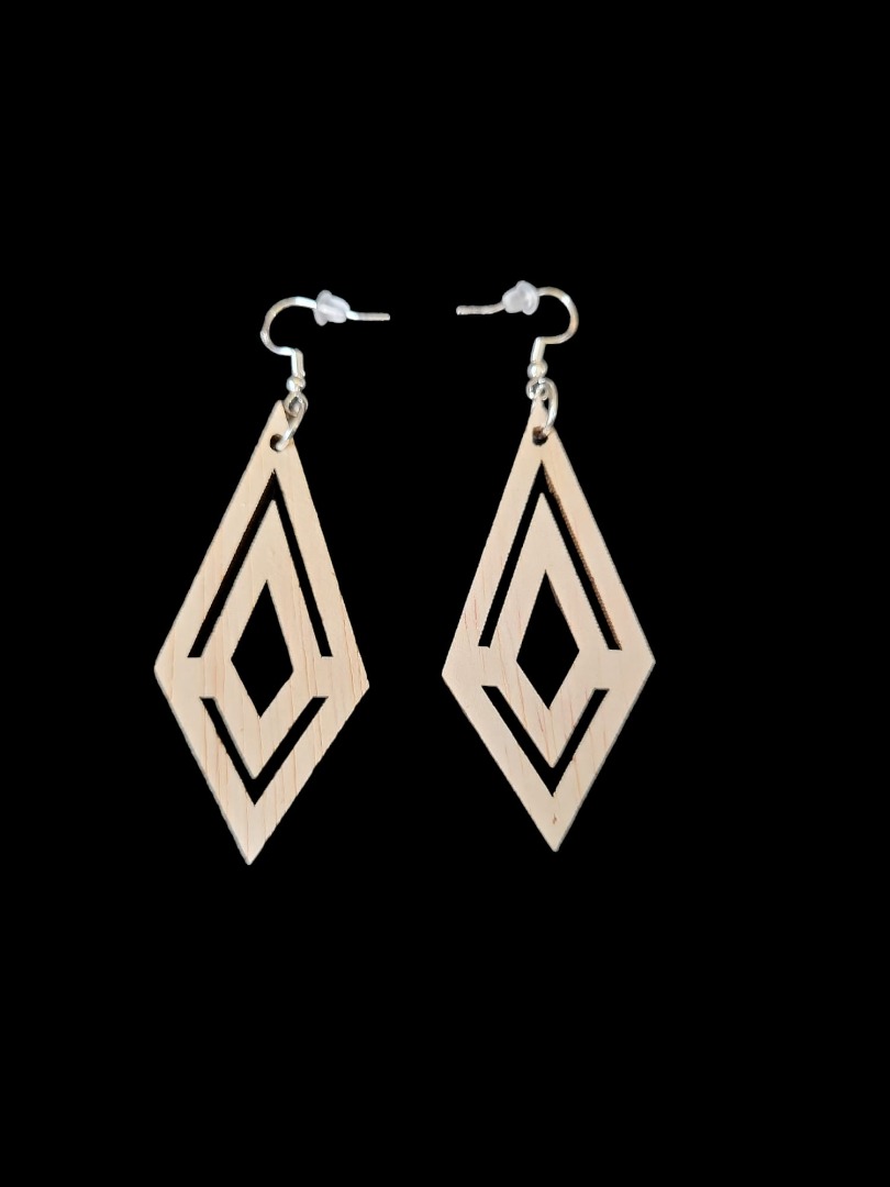 Houten lange oorbellen, genaamd Silvia, gemaakt van timmerplaat 3 mm, afmeting 6 x 4 cm inclusief haakjes en dopje voor niet te verliezen. Inclusief verzendkosten.