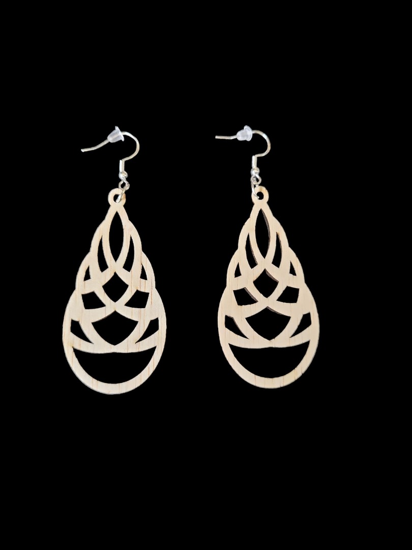 Houten lange oorbellen, genaamd ballon, gemaakt van timmerplaat 3 mm, afmeting 6,5 x 3 cm inclusief haakjes en dopje voor niet te verliezen. Inclusief verzendkosten.