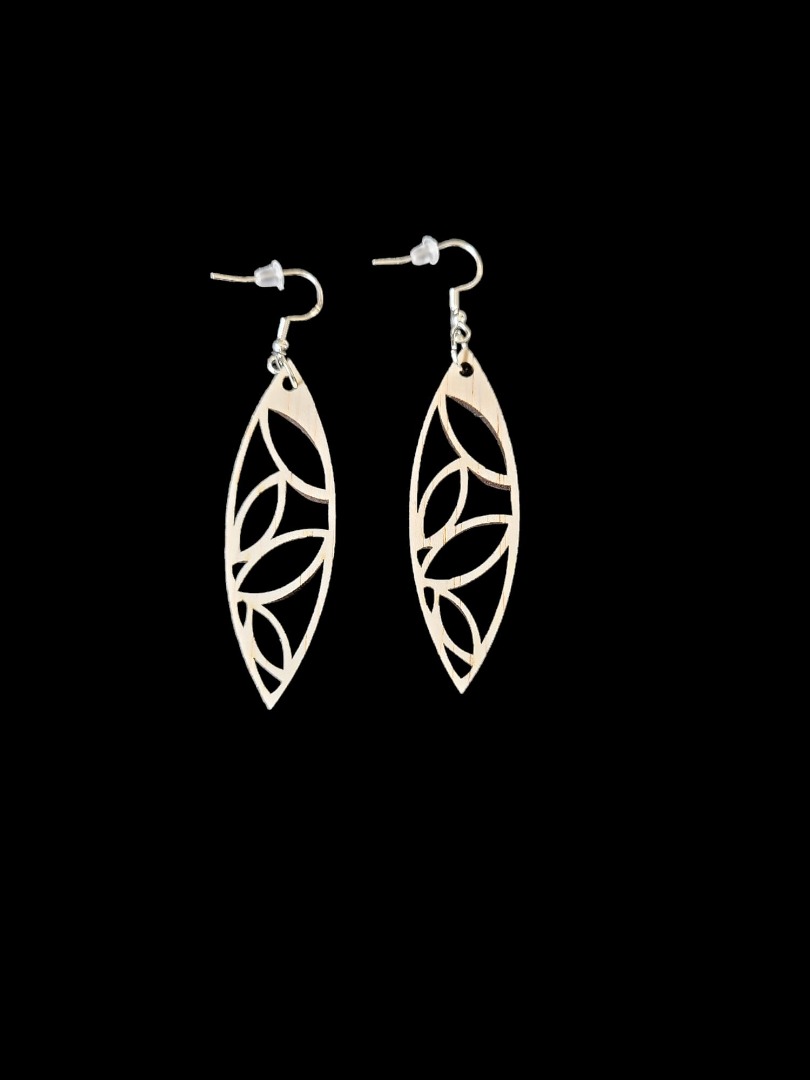 Houten lange oorbellen, genaamd Marsini, gemaakt van timmerplaat 3 mm, afmeting 6 x 4 cm inclusief haakjes en dopje voor niet te verliezen. Inclusief verzendkosten.