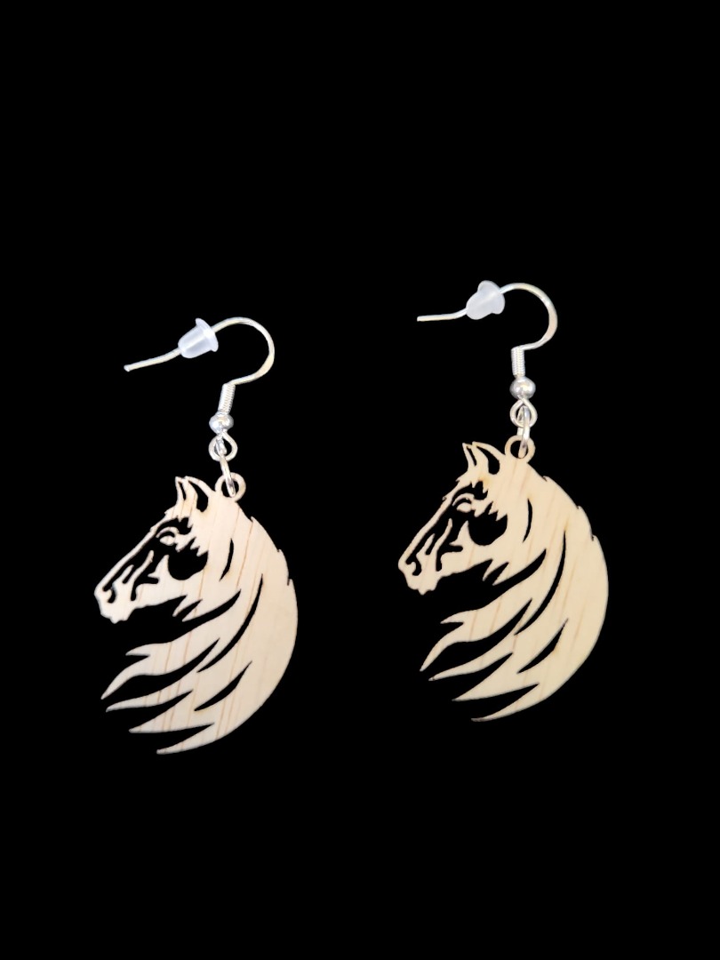 Houten lange oorbellen, paardenhoofd met manen, gemaakt van timmerplaat 3 mm, afmeting 3.5 x 2.5 cm inclusief haakjes en dopje voor niet te verliezen. Inclusief verzendkosten.