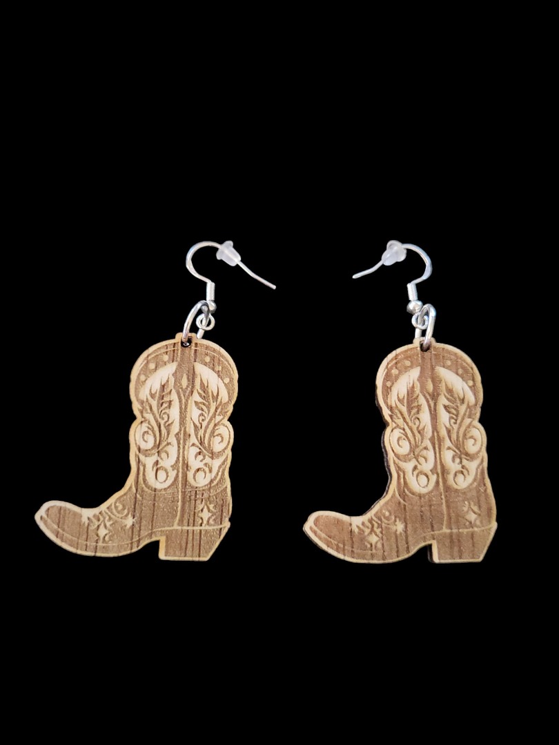 Houten lange oorbellen, cowboylaars, gemaakt van timmerplaat 3 mm, afmeting 4 x 3.5 cm inclusief haakjes en dopje voor niet te verliezen. Inclusief verzendkosten.