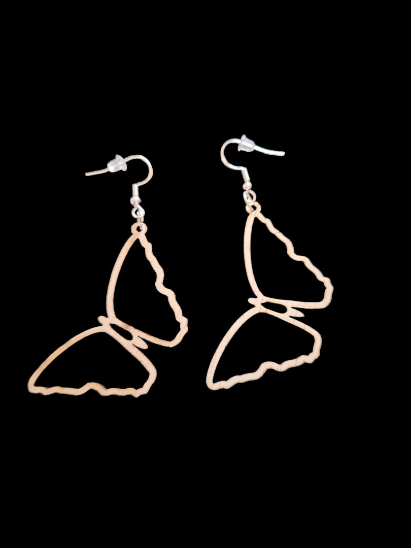 Houten lange oorbellen, vlinder Argus, gemaakt van timmerplaat 3 mm, afmeting 5.5 x 3.5 cm inclusief haakjes en dopje voor niet te verliezen. Inclusief verzendkosten.
