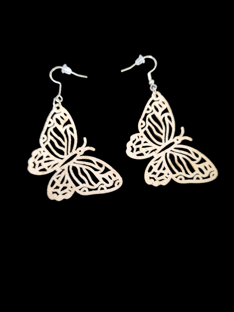 Houten lange oorbellen, vlinder Berberis, gemaakt van timmerplaat 3 mm, afmeting 4 x 2 cm inclusief haakjes en dopje voor niet te verliezen. Inclusief verzendkosten.