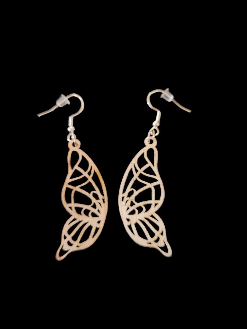Houten lange oorbellen, vleugels Sesia, gemaakt van timmerplaat 3 mm, afmeting 4 x 2 cm inclusief haakjes en dopje voor niet te verliezen. Inclusief verzendkosten.