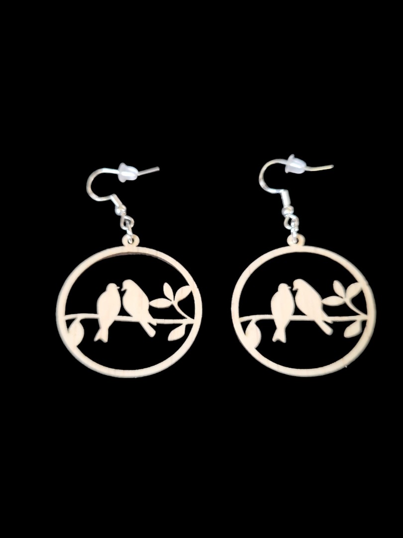 Houten lange oorbellen, twee vogels cirkel, gemaakt van timmerplaat 3 mm, afmeting 2.5 x2.5 cm inclusief haakjes en dopje voor niet te verliezen. Inclusief verzendkosten.