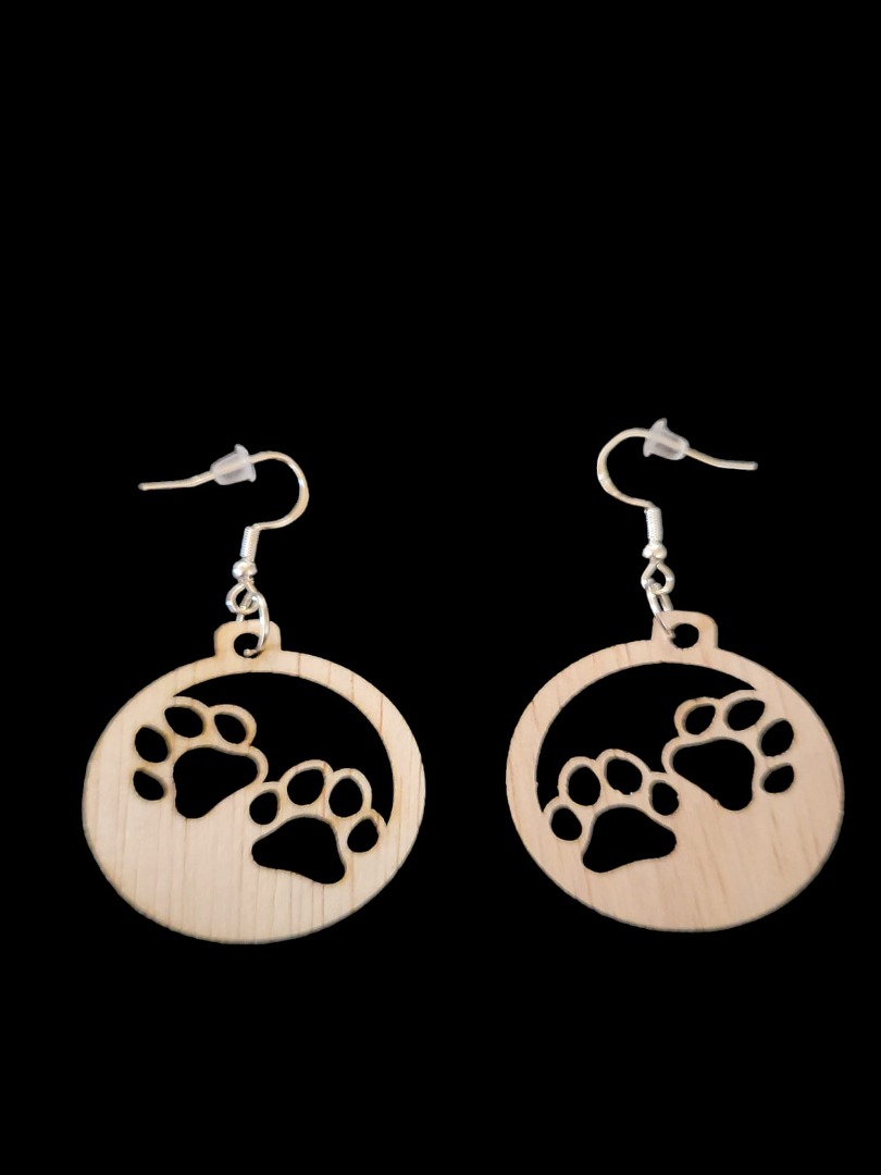 Houten lange oorbellen, hondenpoten ovaal, gemaakt van timmerplaat 3 mm, afmeting 3,5 x 3.,5 cm inclusief haakjes en dopje voor niet te verliezen. Inclusief verzendkosten.