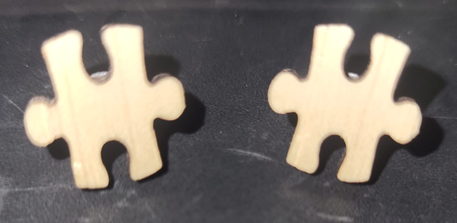 Houten oorbellen, knopjes, puzzelstukje, gemaakt van timmerplaat 3 mm, afmeting 1,5 x 1,5 cm inclusief dopjes achterop voor niet te verliezen. Inclusief verzendkosten.