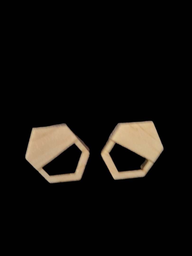 Houten oorbellen, knopjes, zeshoekige ruit, gemaakt van timmerplaat 3 mm, afmeting 2 x 1,5 cm inclusief dopjes achterop voor niet te verliezen. Inclusief verzendkosten.