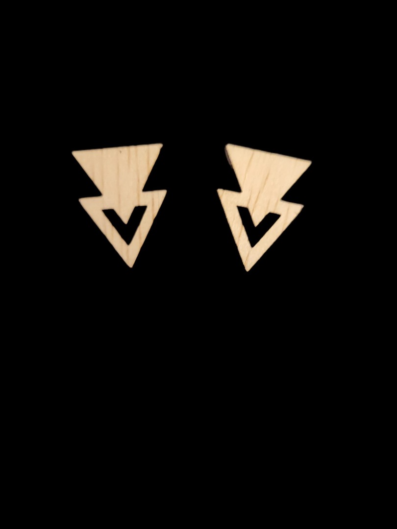 Houten oorbellen, knopjes, dubbele driehoek, gemaakt van timmerplaat 3 mm, afmeting 2 x 1,5 cm inclusief dopjes achterop voor niet te verliezen. Inclusief verzendkosten.