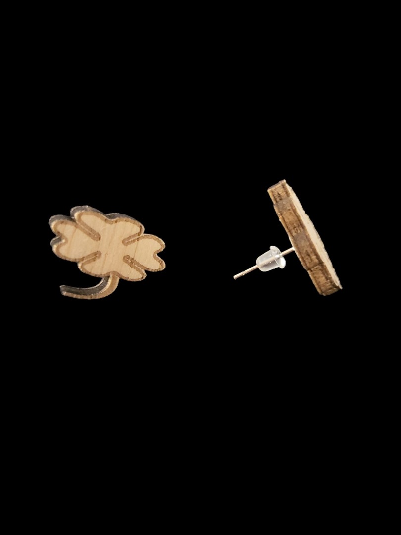 Houten oorbellen, knopjes, klavertje vier, gemaakt van timmerplaat 3 mm, afmeting 2 x 1,5 cm inclusief dopjes achterop voor niet te verliezen. Inclusief verzendkosten.
