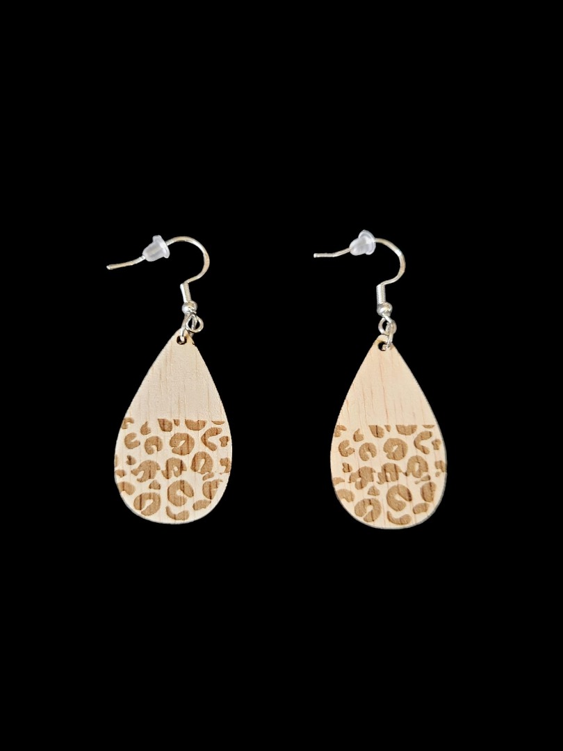 Houten lange oorbellen, panter druppel half, gemaakt van timmerplaat 3 mm, afmeting 4 x 2,5 cm inclusief haakjes en dopje voor niet te verliezen. Inclusief verzendkosten.