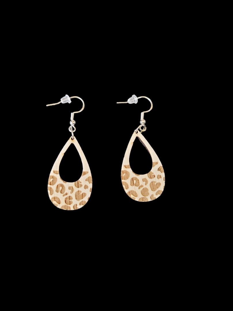 Houten lange oorbellen, panter druppel half open, gemaakt van timmerplaat 3 mm, afmeting 4 x 2,5 cm inclusief haakjes en dopje voor niet te verliezen. Inclusief verzendkosten.