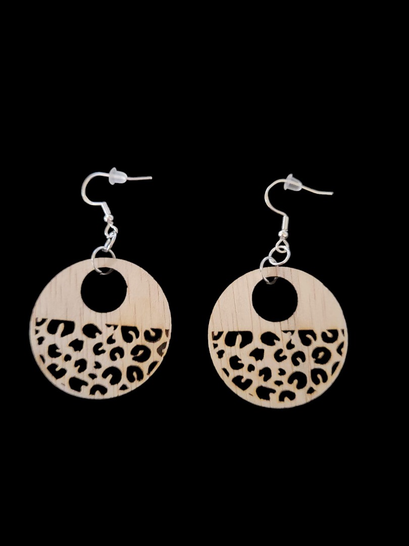 Houten lange oorbellen, panter cirkel half, gemaakt van timmerplaat 3 mm, afmeting 4 x 4 cm inclusief haakjes en dopje voor niet te verliezen. Inclusief verzendkosten.