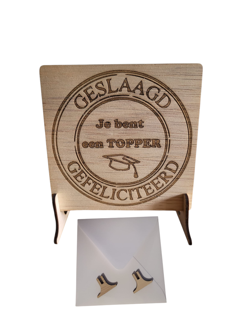 Houten wenskaart gemaakt van multiplex timmerplaat met de tekst gelssgd gelaserd, 12x12cm, dikte 3 mm inclusief 2 voetstukjes en een enveloppe. Inclusief verzendkosten.