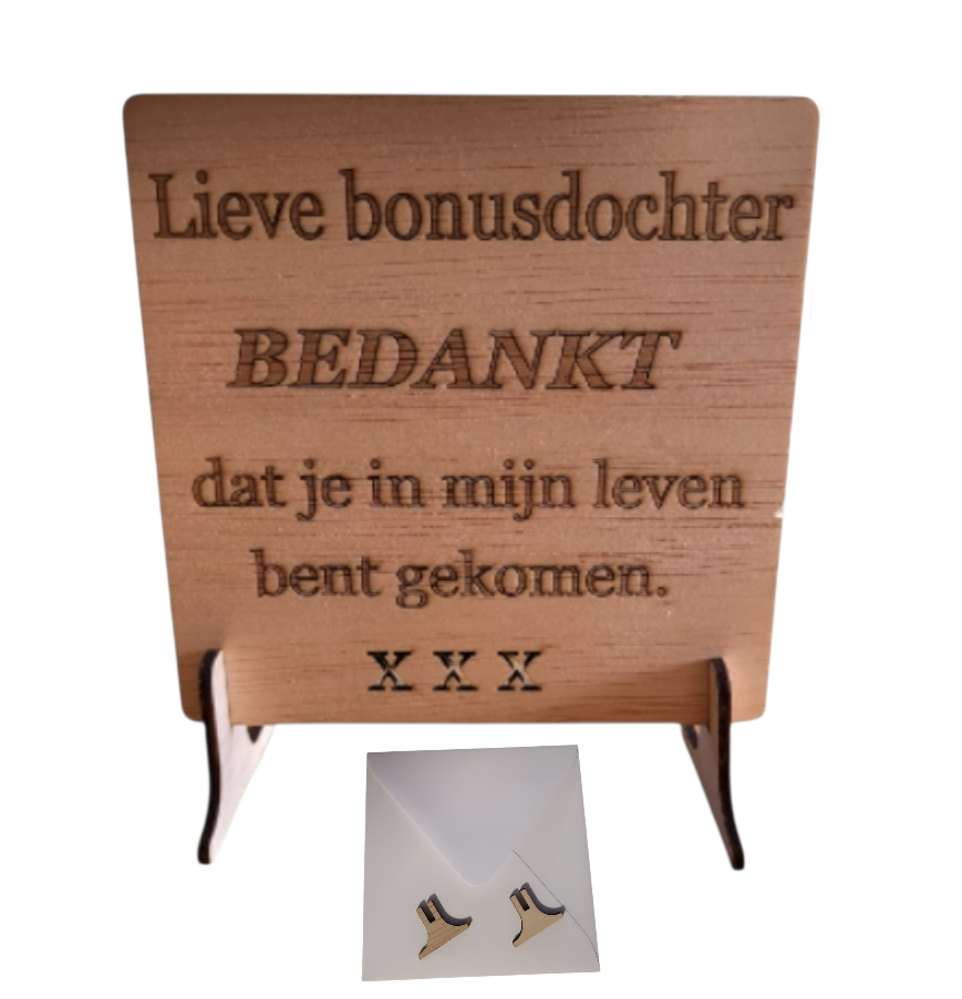 Houten wenskaart gemaakt van multiplex timmerplaat met de tekst lieve bonusdochter gelaserd, 12x12cm, dikte 3 mm inclusief 2 voetstukjes en een enveloppe, naturel, merkloos. Inclusief verzendkosten.