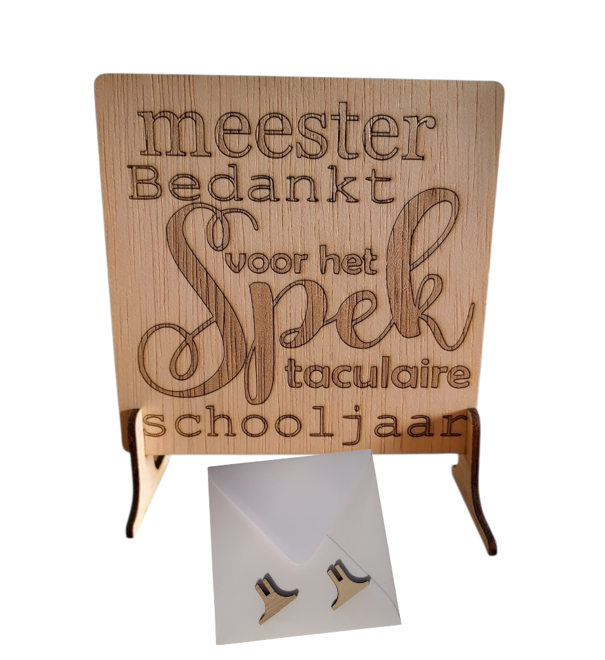 Houten wenskaart gemaakt van multiplex timmerplaat met de tekst meester bedankt gelaserd, 12x12cm, dikte 3 mm inclusief 2 voetstukjes en een enveloppe, naturel, merkloos. Inclusief verzendkosten.